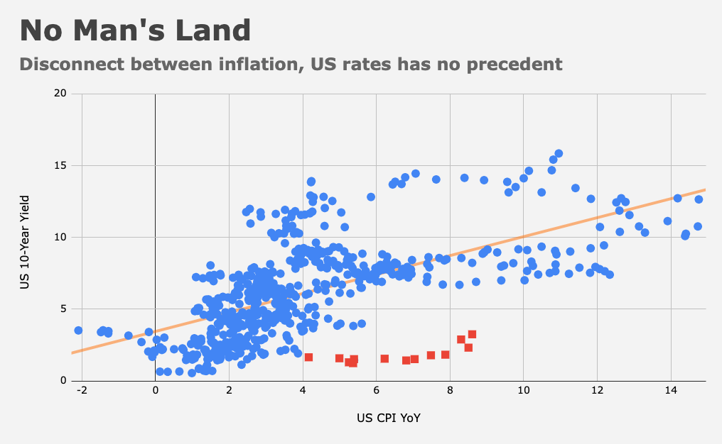 The bottom line here is that there is significant potential for disruption — social, economic and political — if the relationship between inflation and long-end yields normalizes at the same time jobs are shed as the economy chokes on reduced housing activity and higher consumer prices, which is not a ridiculous suggestion.